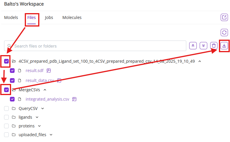 Click on the Files tab in the Balto’s workspace, select files of interest and click on the download button. Protein structures and associated pockets can be exported as PDB files. Molecules and associated docked poses can be exported as either CSV or SDF files.