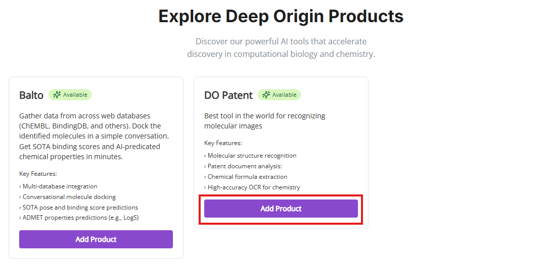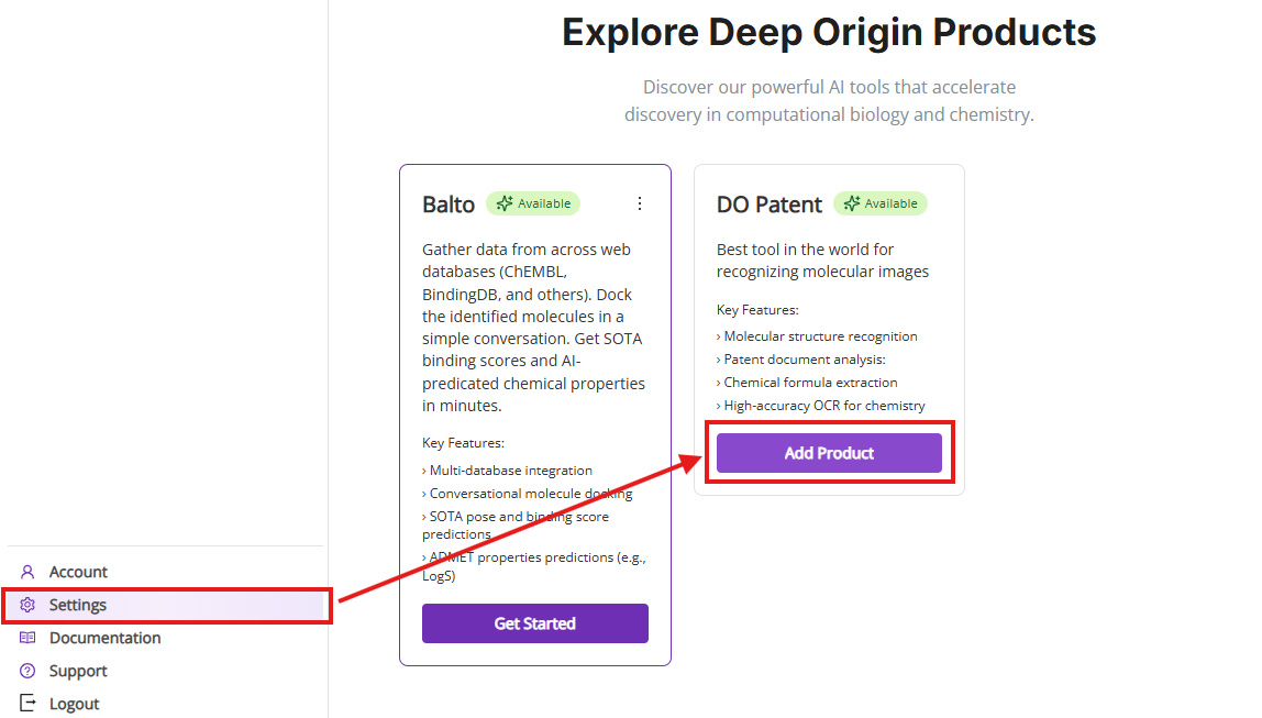2. When you log in to your account at later times, you can go to settings and then click on “Add Product” button for DO Patent.