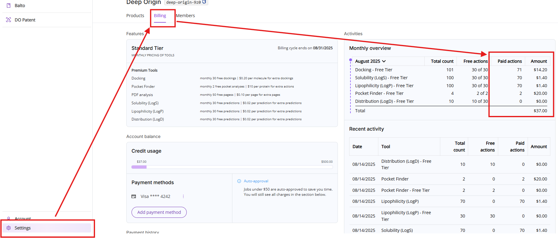 You can see the number of paid pages (actions) used each month by going to the “Billing” tab under Settings. You can also see the monthly quota of free pages and remaining free pages in the same dashboard.